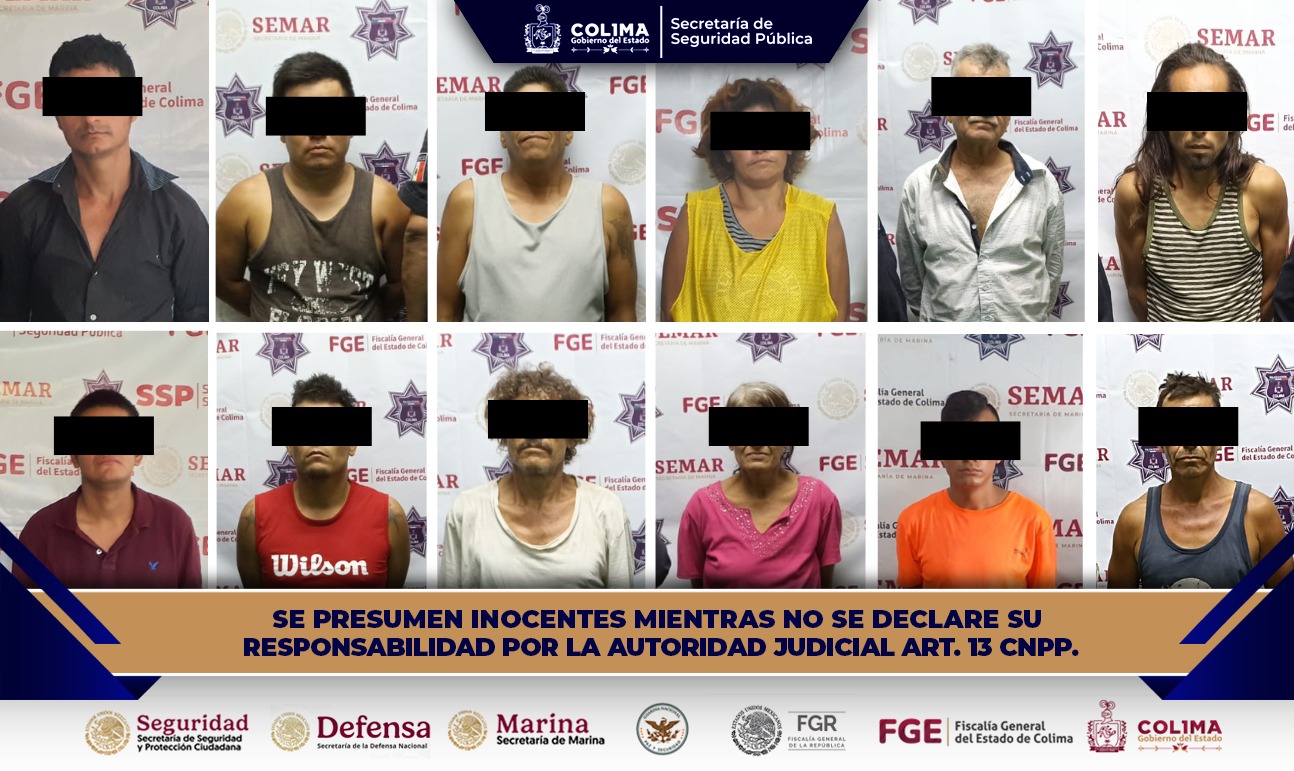 En atención al Eje 4 de la Estrategia Nacional de Seguridad Pública, referente a la coordinación absoluta en el gabinete de seguridad, la Secretaría de Seguridad Pública (SSP) del Gobierno del Estado de Colima informa que, como parte de un operativo interinstitucional con las entidades federativas, se logró la detención de doce personas en distintos hechos ocurridos en los municipios de Manzanillo, Colima y Tecomán, por su probable participación en delitos contra la salud.