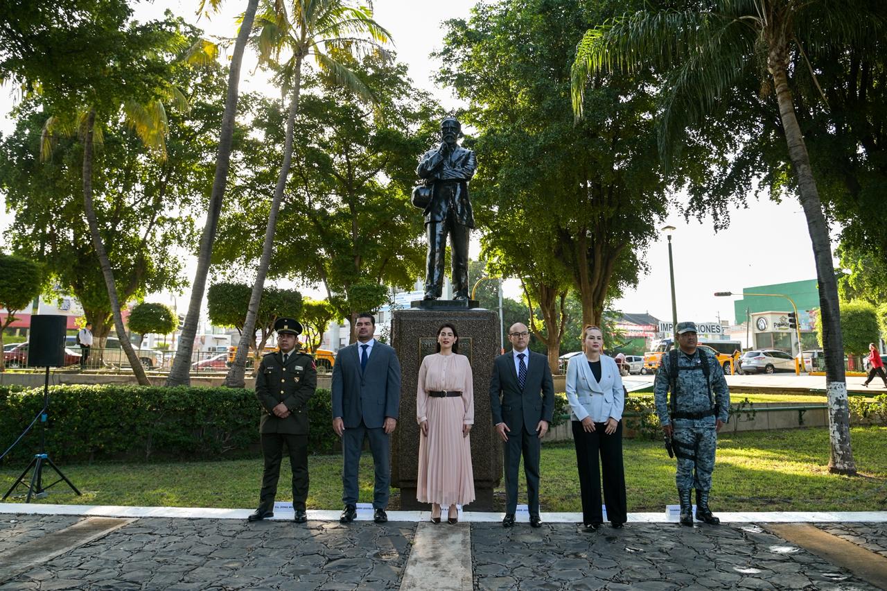 La Secretaria de las Mujeres, Lcda. Ana Chiquete Elizalde, encabezó este evento cívico, en representación del gobernador, el Dr. Rubén Rocha Moya, en el que realizó guardia de honor en el monumento erigido en memoria a Francisco I. Madero, uno de los más importantes impulsores de la democracia de este país; acompañada de las autoridades de los tres niveles de gobierno, civiles y militares.