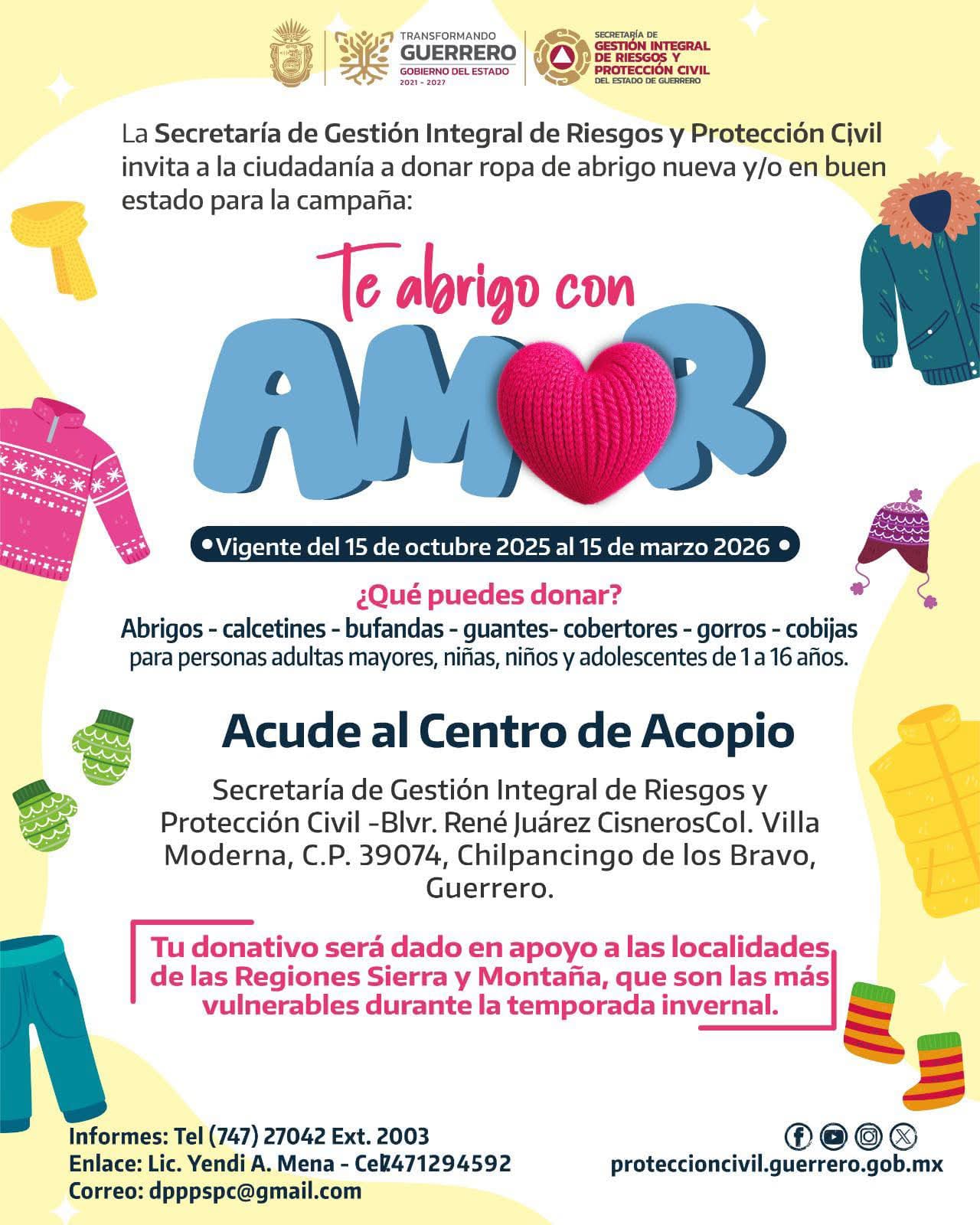 La Secretaría de Gestión Integral de Riesgos y Protección Civil Guerrero (SGIRPCGRO) reiteró el llamado a la ciudadanía a sumarse a la colecta “Te Abrigo con Amor”, una iniciativa impulsada por la gobernadora Evelyn Salgado Pineda, que busca brindar un gesto de solidaridad a familias de las regiones Sierra y Montaña que año con año enfrentan bajas temperaturas durante la temporada invernal.