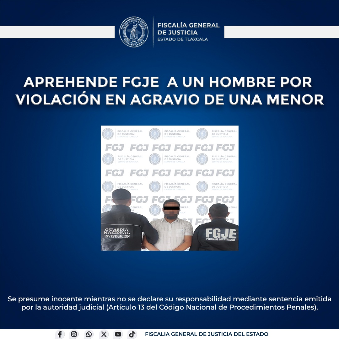 Como resultado de las labores de inteligencia realizadas por la Policía de Investigación, la Fiscalía General de Justicia del Estado (FGJE) aprehendió a Óscar N. por el delito de violación, en agravio de una menor de edad.
