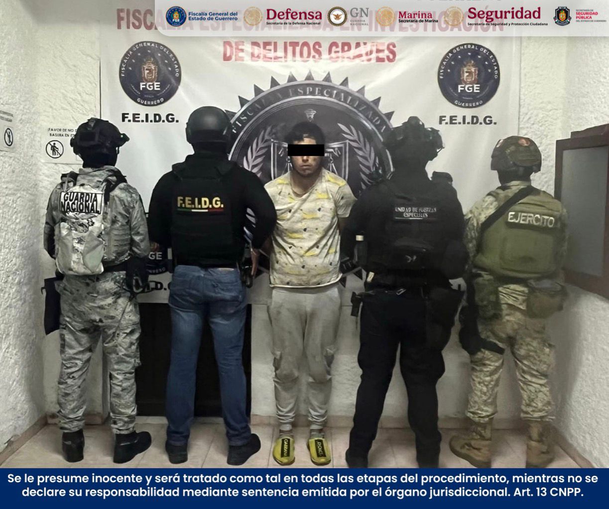 La Fiscalía General del Estado de Guerrero informa que, en acciones coordinadas con la Secretaría de la Defensa Nacional (DEFENSA), Guardia Nacional (GN), Secretaría de Seguridad y Protección Ciudadana (SSPC) y Policía Estatal, fue detenido en flagrancia un masculino identificado como Carlos “N”, en el municipio de Chilpancingo de los Bravo.