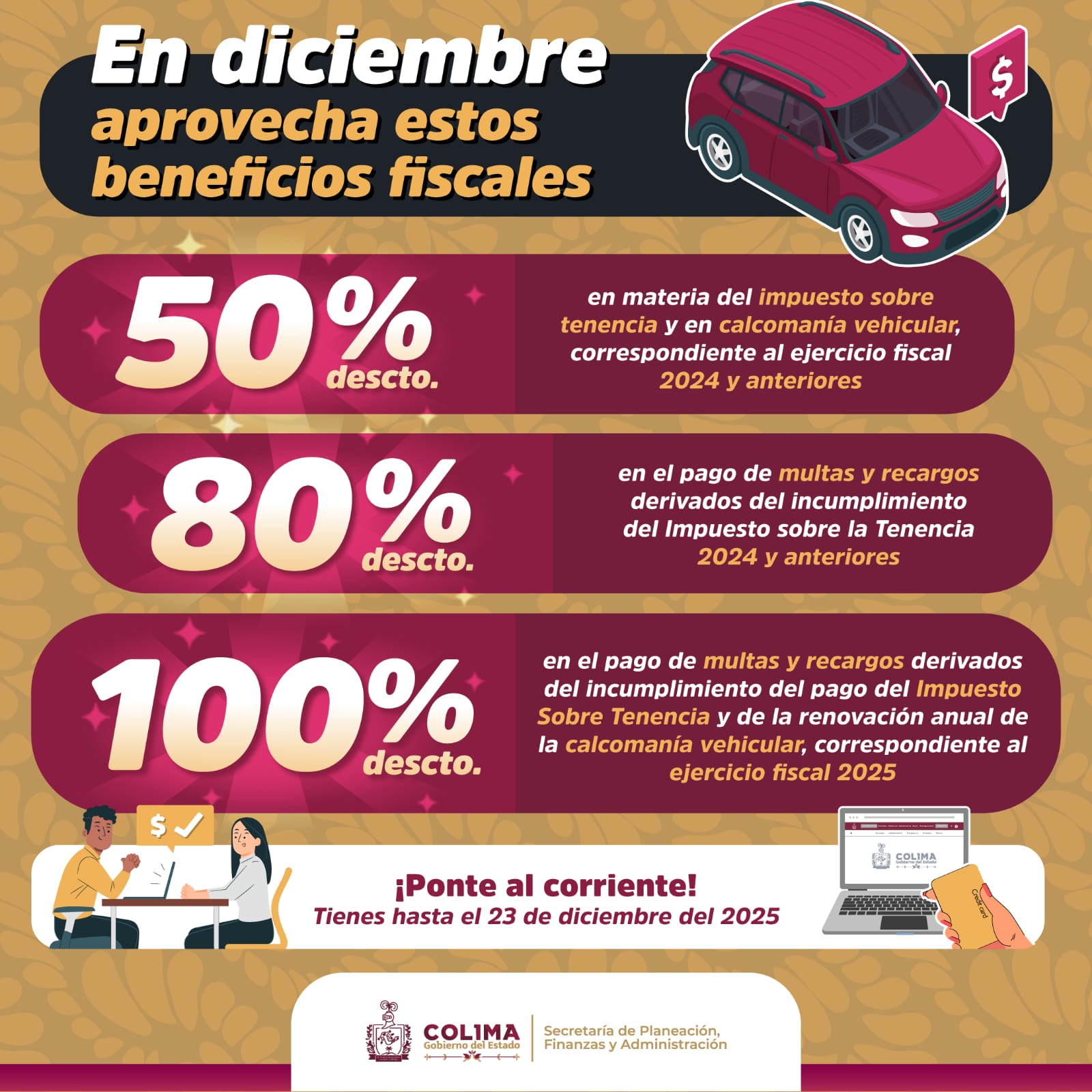 El Gobierno del Estado de Colima, a través de la Secretaría de Planeación Finanzas y Administración (Seplafina), informa a la ciudadanía que, con el objetivo de apoyar la economía de las familias colimenses y fomentar el cumplimiento de las obligaciones fiscales, se han aprobado una serie de estímulos fiscales dirigidos a personas físicas y morales tenedoras o usuarias de vehículos registrados en el Registro Público Vehicular (Repuve) de esta entidad; dichos beneficios vencen este 23 de diciembre y son los siguientes: