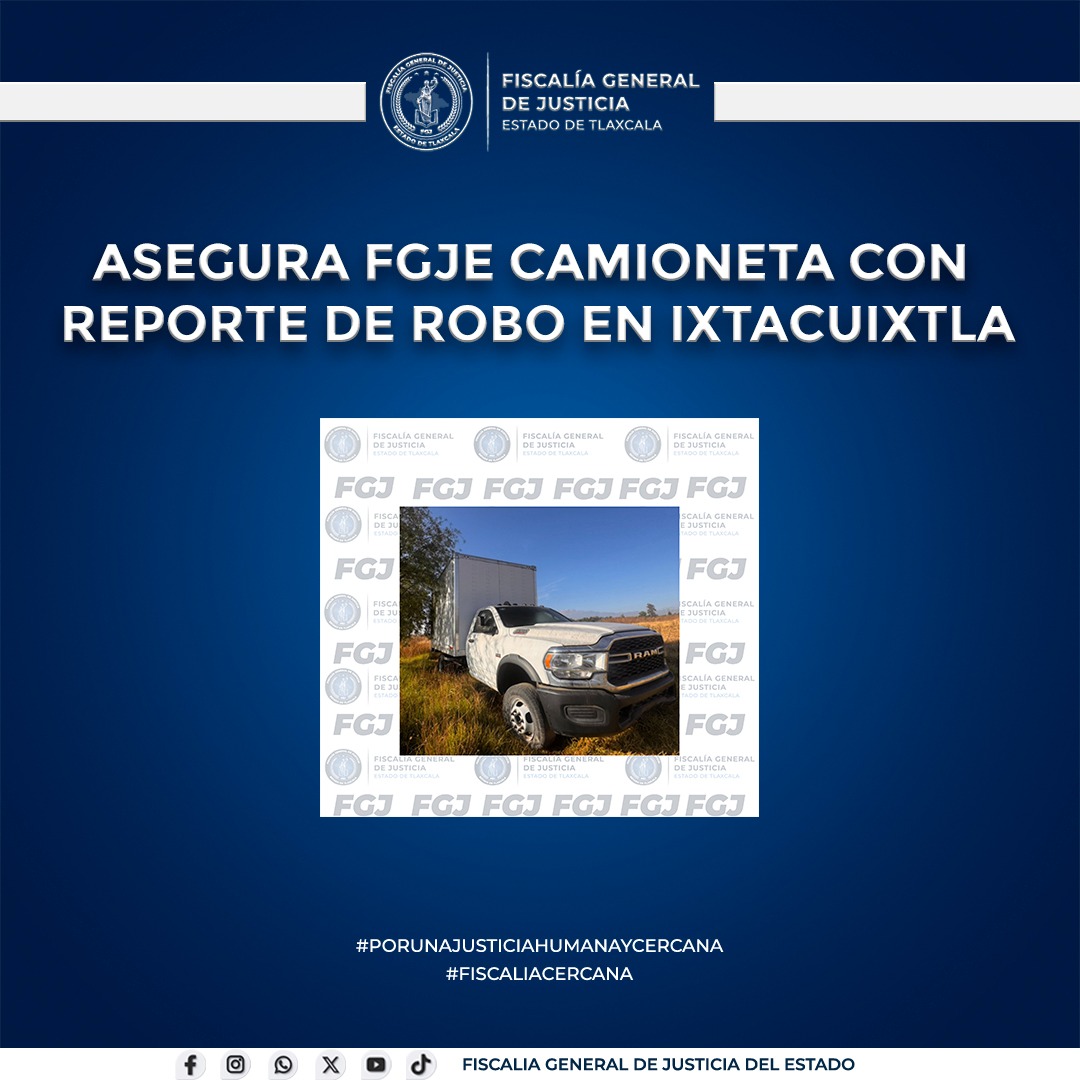 La Policía de Investigación, adscrita a la Fiscalía General de Justicia del Estado (FGJE), aseguró una camioneta marca Dodge, tipo RAM, color blanco, equipada con caja seca, que contaba con reporte de robo vigente.