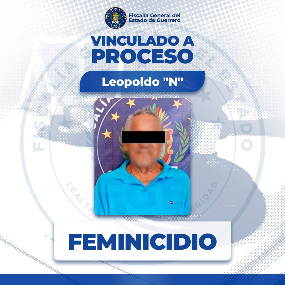 La Fiscalía General del Estado de Guerrero obtuvo la vinculación a proceso de Leopoldo “N”, por su probable responsabilidad en el delito de feminicidio, en agravio de una víctima de identidad reservada, por hechos ocurridos en la comunidad de El Cuco, municipio de San Marcos, Guerrero.