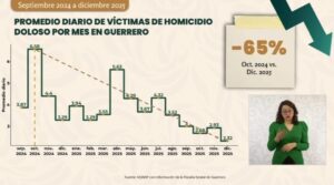 Sheinbaum Pardo subrayó que, al inicio del actual gobierno, Guerrero registraba un promedio de 6.5 homicidios diarios; no obstante, a partir de abril se observó una tendencia a la baja que se consolidó en octubre de 2024, alcanzando al cierre de diciembre un promedio de 2.32 homicidios diarios.