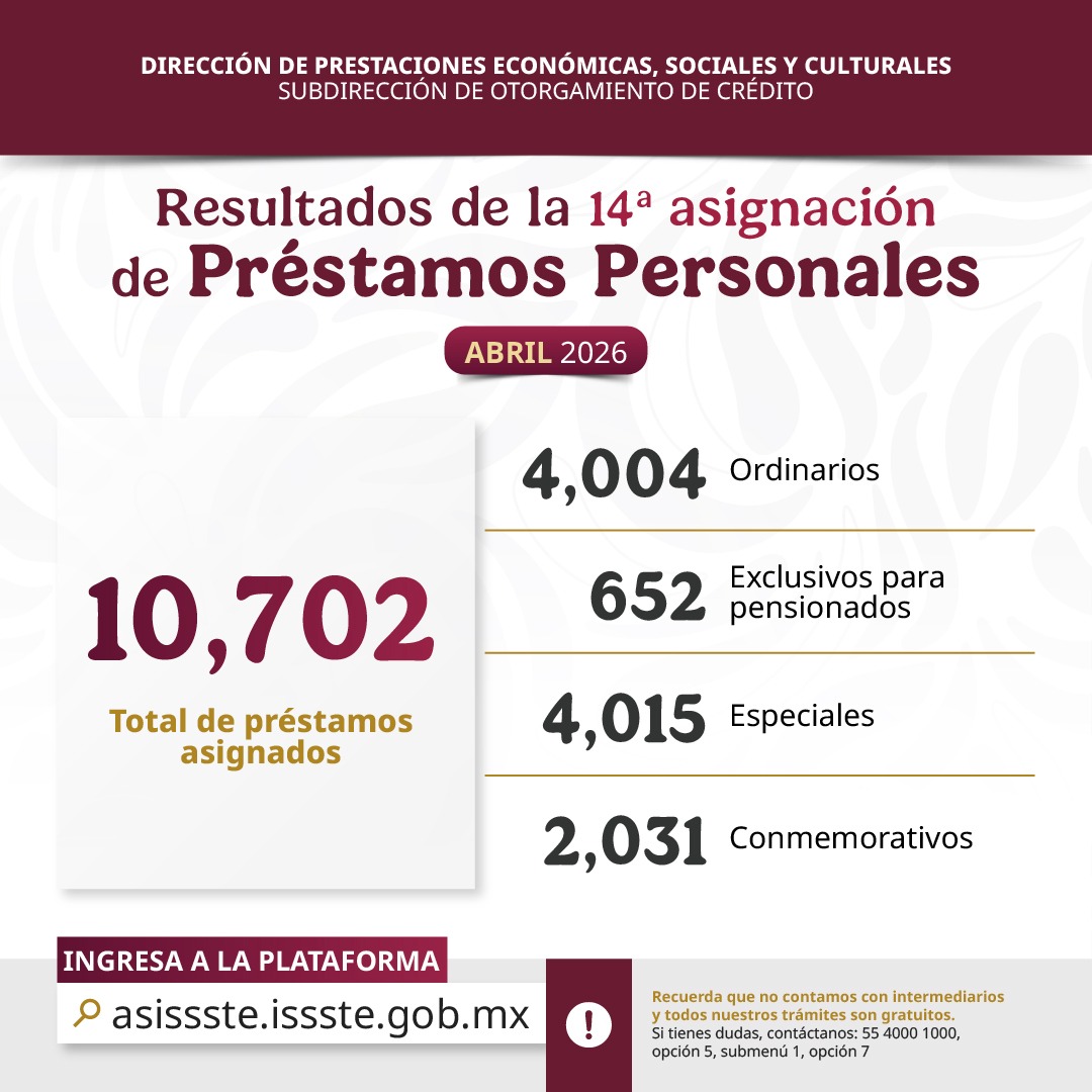 El Instituto de Seguridad y Servicios Sociales de los Trabajadores del Estado (ISSSTE) informa que se otorgaron 10 mil 702 créditos en el Programa Anual de Préstamos Personales 2026, para todos aquellos que cumplieron los requisitos